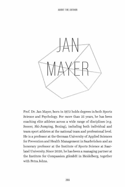Prof. Dr. Jan Mayer, born in 1972 holds degrees in both Sports Science and Psychology. For more than 25 years, he has been coaching elite athletes across a wide range of disciplines (e.g. Soccer, Ski-Jumping, Boxing), including both individual and team sport athletes at the national team and professional level. He is a professor at the German University of Applied Sciences for Prevention and Health Management in Saarbrücken and an honorary professor at the Institute of Sports Science at Saarland University. Since 2020, he has been a managing partner at the Institute for Compassion gGmbH in Heidelberg, together with Petra Johns.