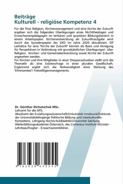 Für die Trias Religion, Kirchenmanagement und eine Kirche der Zukunft ergeben sich die folgenden Überlegungen eines Nichttheologen und Erwachsenenpädagogen im tertiären und quartären Bildungsbereich in einem Arbeitspapier. Kirchenentwicklung als Zukunftsaufgabe wird durch das Synodenpapier der EKD im Jahre 2020 aktualisiert. Elf Leitsätze für eine "Kirche der Zukunft" können als Basis und Anregung für Perspektiven in Verbindung mit grundsätzlichen Überlegungen über Religion, Kirchen- und Gemeindeentwicklung sowie Kirche der Zukunft angesehen werden. Für Kirchen und ihre Mitglieder in einer Diasporasituation stellt sich die Thematik als eine Existenzfrage in einer pluralen Gesellschaft. Ergänzend ergibt sich die Notwendigkeit einer Stärkung des "Ehrenamtes"/ Freiwilligenmanagements.