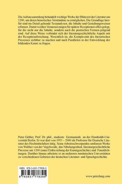 Peter Göhler, Prof. Dr. phil., studierte Germanistik an der Humboldt-Universität Berlin. Er war dort von 1993 ¿ 2000 als Professor für Deutsche Literatur des Hochmittelalters tätig. Seine Arbeitsschwerpunkte umfassen Werke von Walther von der Vogelweide, das Nibelungenlied, literaturgeschichtliche Prozesse um 1200 (unter Einbeziehung der Kunstgeschichte) und Faustdichtungen. Darüber hinaus arbeitete er an mehreren rumänischen Universitäten zu verschiedenen Gebieten der deutschen Literatur- und Sprachgeschichte.