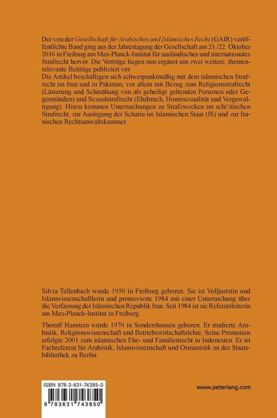 Der von der «Gesellschaft für Arabisches und Islamisches Recht» (GAIR) veröffentlichte Band ging aus der Jahrestagung der Gesellschaft im Oktober 2016 in Freiburg am Max-Planck-Institut für ausländisches und internationales Strafrecht hervor. Die Vorträge liegen nun ergänzt um zwei weitere, themenrelevante Beiträge publiziert vor. Die Artikel beschäftigen sich schwerpunktmäßig mit dem islamischen Strafrecht im Iran und in Pakistan, vor allem mit Bezug zum Religionsstrafrecht (Lästerung und Schmähung von als geheiligt geltenden Personen oder Gegenständen) und Sexualstrafrecht (Ehebruch, Homosexualität und Vergewaltigung). Hinzu kommen Untersuchungen zu Strafzwecken im schi itischen Strafrecht, zur Auslegung der Scharia im Islamischen Staat (IS) und zur Iranischen Rechtsanwaltskammer.