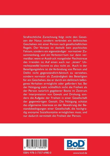 Strafrechtliche Zurechnung folgt nicht den Gesetzen der Natur, sondern verbindet ein deliktisches Geschehen mit einer Person nach gesellschaftlichen Regeln. Der Vorsatz ist deshalb kein psychisches Faktum, sondern ein eigenständiger normativer Zusammenhang, und ein Verbotsirrtum nur dann vermeidbar, wenn er Ausdruck mangelnder Rechtstreue des Irrenden ist. Auf einen auch nur "leisen" Unrechtszweifel kommt es also nicht an.Auch in der Beteiligungslehre ist die Verbindung von Person und Delikt nicht gegenständlich-faktisch zu verstehen, sondern normativ als Zuständigkeit des Beteiligten für ein Geschehen, das er durch ein deliktisch befangenes Verhalten ermöglicht oder gefördert hat. Bei der Nötigung steht schließlich nicht die Freiheit als der Person natürlich gegebener Besitz im Zentrum der Interpretation von Gewalt und Drohung, sondern die Aufgabe der Freiheit in einer Gesellschaft der gegenwärtigen Gestalt. Die Nötigung schützt das allgemeine Interesse an der Bewahrung der Bestandsbedingungen einer Gesellschaft, die hochgradig anonyme Sozialkontakte ermöglichen muss, und nur dadurch vermittelt die Freiheit der Person.
