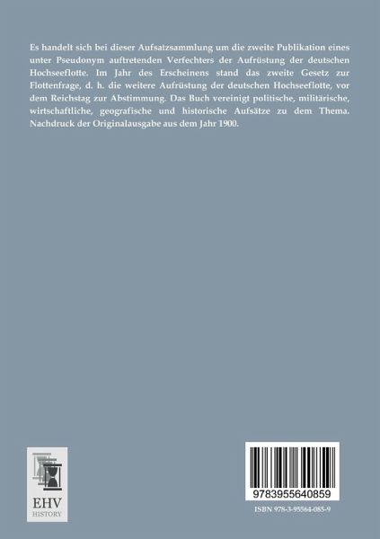 Es handelt sich bei dieser Aufsatzsammlung um die zweite Publikation eines unter Pseudonym auftretenden Verfechters der Aufrüstung der deutschen Hochseeflotte. Im Jahr des Erscheinens stand das zweite Gesetz zur Flottenfrage, d. h. die weitere Aufrüstung der deutschen Hochseeflotte, vor dem Reichstag zur Abstimmung. Das Buch vereinigt politische, militärische, wirtschaftliche, geografische und historische Aufsätze zu dem Thema. Nachdruck der Originalausgabe aus dem Jahr 1900.