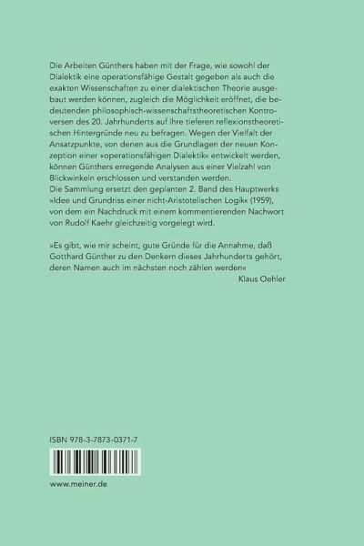 Die Arbeiten Günthers haben mit der Frage, wie sowohl der Dialektik eine operationsfähige Gestalt gegeben als auch die exakten Wissenschaften zu einer dialektischen Theorie ausgebaut werden können, zugleich die Möglichkeit eröffnet, die bedeutenden philosophisch-wissenschaftstheoretischen Kontroversen des 20. Jahrhunderts auf ihre tieferen reflexionstheoretischen Hintergründe neu zu befragen. Wegen der Vielfalt der Ansatzpunkte, von denen aus die Grundlagen der neuen Konzeption einer 'operationsfähigen Dialektik' entwickelt werden, können Günthers erregende Analysen aus einer Vielzahl von Blickwinkeln erschlossen und verstanden werden. Die Sammlung ersetzt den geplanten 2. Band des Hauptwerks 'Idee und Grundriss einer nicht-Aristotelischen Logik' (1959), von dem ein Nachdruck mit einem kommentierenden Nachwort von Rudolf Kaehr gleichzeitig vorgelegt wird.