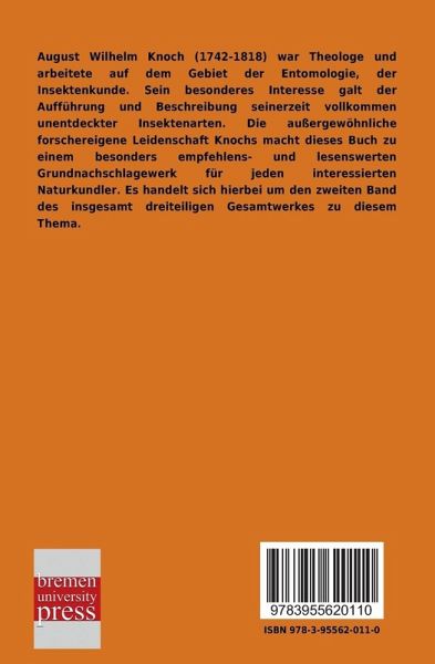 August Wilhelm Knoch (1742-1818) war Theologe und arbeitete auf dem Gebiet der Entomologie, der Insektenkunde. Sein besonderes Interesse galt der Aufführung und Beschreibung seinerzeit vollkommen unentdeckter Insektenarten. Die außergewöhnliche forschereigene Leidenschaft Knochs macht dieses Buch zu einem besonders empfehlens- und lesenswerten Grundnachschlagewerk für jeden interessierten Naturkundler. Es handelt sich hierbei um den zweiten Band des insgesamt dreiteiligen Gesamtwerkes zu diesem Thema.