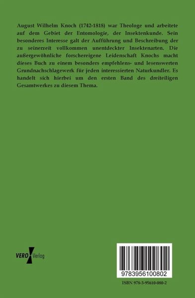 August Wilhelm Knoch (1742-1818) war Theologe und arbeitete auf dem Gebiet der Entomologie, der Insektenkunde. Sein besonderes Interesse galt der Aufführung und Beschreibung der zu seinerzeit vollkommen unentdeckter Insektenarten. Die außergewöhnliche forschereigene Leidenschaft Knochs macht dieses Buch zu einem besonders empfehlens- und lesenswerten Grundnachschlagewerk für jeden interessierten Naturkundler. Es handelt sich hierbei um den ersten Band des dreiteiligen Gesamtwerkes zu diesem Thema.