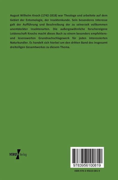 August Wilhelm Knoch (1742-1818) war Theologe und arbeitete auf dem Gebiet der Entomologie, der Insektenkunde. Sein besonderes Interesse galt der Aufführung und Beschreibung der zu seinerzeit vollkommen unentdeckter Insektenarten. Die außergewöhnliche forschereigene Leidenschaft Knochs macht dieses Buch zu einem besonders empfehlens- und lesenswerten Grundnachschlagewerk für jeden interessierten Naturkundler. Es handelt sich hierbei um den dritten Band des insgesamt dreiteiligen Gesamtwerkes zu diesem Thema.