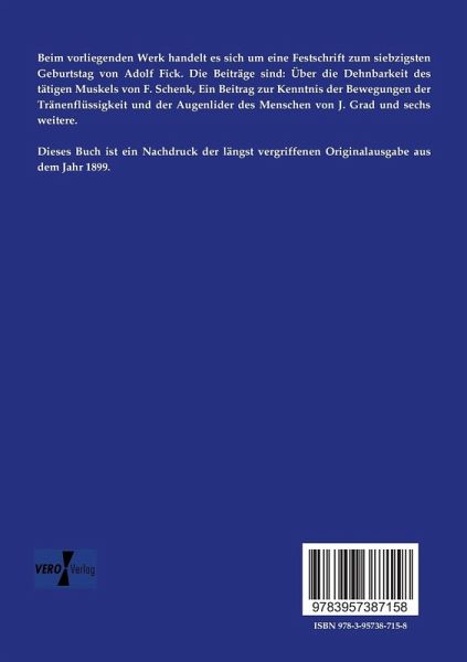 Beim vorliegenden Werk handelt es sich um eine Festschrift zum siebzigsten Geburtstag von Adolf Fick. Die Beiträge sind: Über die Dehnbarkeit des tätigen Muskels von F. Schenk, Ein Beitrag zur Kenntnis der Bewegungen der Tränenflüssigkeit und der Augenlider des Menschen von J. Grad und sechs weitere.