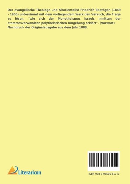 Der evangelische Theologe und Altorientalist Friedrich Baethgen (1849 - 1905) unternimmt mit dem vorliegendem Werk den Versuch, die Frage zu lösen, "wie sich der Monotheismus Israels inmitten der stammesverwandten polytheistischen Umgebung erklärt". (Vorwort) Nachdruck der Originalausgabe aus dem Jahr 1888.