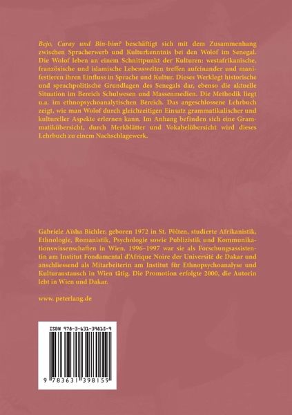 Bejo, Curay und Bin-bim? beschäftigt sich mit dem Zusammenhang zwischen Spracherwerb und Kulturkenntnis bei den Wolof im Senegal. Die Wolof leben an einem Schnittpunkt der Kulturen: westafrikanische, französische und islamische Lebenswelten treffen aufeinander und manifestieren ihren Einfluss in Sprache und Kultur. Dieses Werk legt historische und sprachpolitische Grundlagen des Senegals dar, ebenso die aktuelle Situation im Bereich Schulwesen und Massenmedien. Die Methodik liegt u. a. im ethnopsychoanalytischen Bereich. Das angeschlossene Lehrbuch zeigt, wie man Wolof durch gleichzeitigen Einsatz grammatikalischer und kultureller Aspekte erlernen kann. Im Anhang befinden sich eine Grammatikübersicht, durch Merkblätter und Vokabelübersicht wird dieses Lehrbuch zu einem Nachschlagewerk.