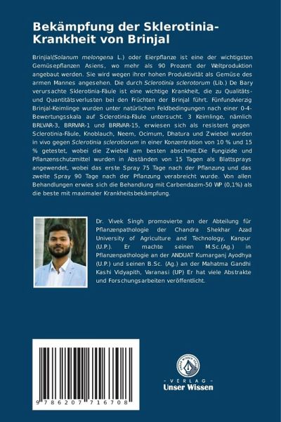 Brinjial(Solanum melongena L.) oder Eierpflanze ist eine der wichtigsten Gemüsepflanzen Asiens, wo mehr als 90 Prozent der Weltproduktion angebaut werden. Sie wird wegen ihrer hohen Produktivität als Gemüse des armen Mannes angesehen. Die durch Sclerotinia sclerotorum (Lib.) De Bary verursachte Sklerotinia-Fäule ist eine wichtige Krankheit, die zu Qualitäts- und Quantitätsverlusten bei den Früchten der Brinjal führt. Fünfundvierzig Brinjal-Keimlinge wurden unter natürlichen Feldbedingungen nach einer 0-4-Bewertungsskala auf Sclerotinia-Fäule untersucht. 3 Keimlinge, nämlich BRLVAR-3, BRRVAR-1 und BRRVAR-15, erwiesen sich als resistent gegen Sclerotinia-Fäule, Knoblauch, Neem, Ocimum, Dhatura und Zwiebel wurden in vivo gegen Sclerotinia sclerotiorum in einer Konzentration von 10 % und 15 % getestet, wobei die Zwiebel am besten abschnitt.Die Fungizide und Pflanzenschutzmittel wurden in Abständen von 15 Tagen als Blattsprays angewendet, wobei das erste Spray 75 Tage nach der Pflanzung und das zweite Spray 90 Tage nach der Pflanzung verabreicht wurde. Von allen Behandlungen erwies sich die Behandlung mit Carbendazim-50 WP (0,1%) als die beste mit maximaler Krankheitsbekämpfung.