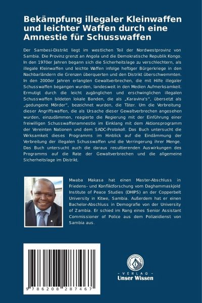 Der Sambesi-Distrikt liegt im westlichen Teil der Nordwestprovinz von Sambia. Die Provinz grenzt an Angola und die Demokratische Republik Kongo. In den 1970er Jahren begann sich die Sicherheitslage zu verschlechtern, als illegale Kleinwaffen und leichte Waffen infolge heftiger Bürgerkriege in den Nachbarländern die Grenzen überquerten und den Distrikt überschwemmten. In den 2000er Jahren erlangten Gewaltverbrechen, die mit Hilfe illegaler Schusswaffen begangen wurden, landesweit in den Medien Aufmerksamkeit. Ermutigt durch die leicht zugänglichen und erschwinglichen illegalen Schusswaffen bildeten lokale Banden, die als "Karavina's", übersetzt als "gedungene Mörder", bezeichnet wurden, die Täter. Um die Verbreitung dieser Angriffswaffen, die als Ursache dieser Gewaltverbrechen angesehen wurden, einzudämmen, reagierte die Regierung mit der Einführung einer freiwilligen Schusswaffenamnestie im Einklang mit dem Aktionsprogramm der Vereinten Nationen und dem SADC-Protokoll. Das Buch untersucht die Wirksamkeit dieses Programms im Hinblick auf die Eindämmung der Verbreitung der illegalen Schusswaffen und die Verringerung ihrer Menge. Das Buch untersucht auch die daraus resultierenden Auswirkungen des Programms auf die Rate der Gewaltverbrechen und die allgemeine Sicherheitslage im Distrikt.