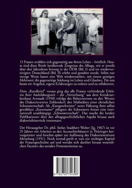 15 Frauen erzählen sich gegenseitig aus ihrem Leben - brieflich. Heute sind diese Briefe berührende Zeugnisse des Alltags, wie er jeweils über drei Jahrzehnte hinweg in der DDR (Bd. I) und im wiedervereinigten Deutschland (Bd. II) erlebt und gestaltet wurde. Selbst nur wenige Worte lassen eine Welt wiedererstehen, mit einem geistigen Mehrwert: die gegenseitige Stärkung im Leben und Glauben. Für uns heute ein Angebot, eigene Erfahrungen zu ordnen und zu reflektieren.Dem "Rundbrief" voraus ging das alle Frauen verbindende Erlebnis ihrer Ausbildungszeit - die "Vertreibung" aus dem Kreiskrankenhaus Arnstadt (1958) infolge des Bekenntnisses zu den Werten des Diakonievereins Zehlendorf; den Maßstäben einer christlichen "Schwesternschaft". Das macht die beiden Publikationen über den alltagsgeschichtlichen Aspekt hinaus auch diakoniehistorisch interessant.