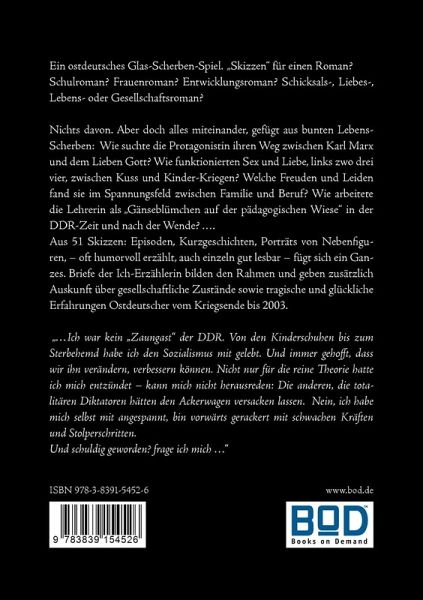 Ein ostdeutsches Glas-Scherben-Spiel. "Skizzen" für einen Roman?Schulroman? Frauenroman? Entwicklungsroman? Schicksals-, Liebes-, Lebens- oder Gesellschaftsroman? Nichts davon. Aber doch alles miteinander, gefügt aus bunten Lebens-Scherben: Wie suchte die Protagonistin ihren Weg zwischen Karl Marx und dem Lieben Gott? Wie funktionierten Sex und Liebe, links zwo drei vier, zwischen Kuss und Kinder-Kriegen? Welche Freuden und Leiden fand sie im Spannungsfeld zwischen Familie und Beruf? Wie arbeitete die Lehrerin als "Gänseblümchen auf der pädagogischen Wiese" in der DDR-Zeit und nach der Wende? ... Aus 51 Skizzen: Episoden, Kurzgeschichten, Porträts von Nebenfigu-ren, - oft humorvoll erzählt, auch einzeln gut lesbar - fügt sich ein Ganzes. Briefe der Ich-Erzählerin bilden den Rahmen und geben zusätzlich Auskunft über gesellschaftliche Zustände sowie tragische und glückliche Erfahrungen Ostdeutscher vom Kriegsende bis 2003. "... Ich war kein "Zaungast" der DDR. Von den Kinderschuhen bis zum Sterbehemd habe ich den Sozialismus mit gelebt. Und immer gehofft, dass wir ihn verändern, verbessern können. Nicht nur für die reine Theorie hatte ich mich entzündet - kann mich nicht herausreden: Die anderen, die totalitären Diktatoren hätten den Ackerwagen versacken lassen. Nein, ich habe mich selbst mit angespannt, bin vorwärts gerackert mit schwachen Kräften und Stolperschritten. Und schuldig geworden? frage ich mich ..."
