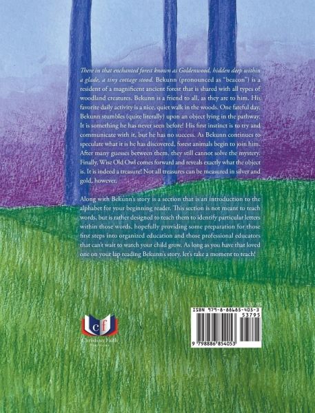 There in that enchanted forest known as Goldenwood, hidden deep within a glade, a tiny cottage stood. Bekunn (pronounced as "beacon") is a resident of a magnificent ancient forest that is shared with all types of woodland creatures. Bekunn is a friend to all, as they are to him. His favorite daily activity is a nice, quiet walk in the woods. One fateful day, Bekunn stumbles (quite literally) upon an object lying in the pathway. It is something he has never seen before! His first instinct is to try and communicate with it, but he has no success. As Bekunn continues to speculate what it is he has discovered, forest animals begin to join him. After many guesses between them, they still cannot solve the mystery. Finally, Wise Old Owl comes forward and reveals exactly what the object is. It is indeed a treasure! Not all treasures can be measured in silver and gold, however. Along with Bekunn's story is a section that is an introduction to the alphabet for your beginning reader. This section is not meant to teach words, but is rather designed to teach them to identify particular letters within those words, hopefully providing some preparation for those first steps into organized education and those professional educators that can't wait to watch your child grow. As long as you have that loved one on your lap reading Bekunn's story, let's take a moment to teach!