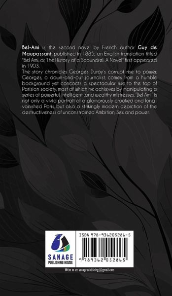 Bel-Ami is the second novel by French author Guy de Maupassant, published in 1885; an English translation titled ""Bel Ami, or, The History of a Scoundrel: A Novel"" first appeared in 1903. The story chronicles Georges Duroy's corrupt rise to power. Georges, a down-and-out journalist, comes from a humble background yet concocts a spectacular rise to the top of Parisian society, most of which he achieves by manipulating a series of powerful, intelligent ,and wealthy mistresses. "Bel Ami" is not only a vivid portrait of a glamorously crooked and long-vanished Paris, but also a strikingly modern depiction of the destructiveness of unconstrained Ambition, Sex and power.