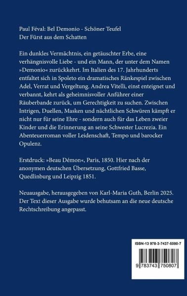 Paul Féval: Bel Demonio - Schöner Teufel. Der Fürst aus dem Schatten Ein dunkles Vermächtnis, ein getäuschter Erbe, eine verhängnisvolle Liebe - und ein Mann, der unter dem Namen »Demonio« zurückkehrt. Im Italien des 17. Jahrhunderts entfaltet sich in Spoleto ein dramatisches Ränkespiel zwischen Adel, Verrat und Vergeltung. Andrea Vitelli, einst enteignet und verbannt, kehrt als geheimnisvoller Anführer einer Räuberbande zurück, um Gerechtigkeit zu suchen. Zwischen Intrigen, Duellen, Masken und nächtlichen Schwüren kämpft er nicht nur für seine Ehre - sondern auch für das Leben zweier Kinder und die Erinnerung an seine Schwester Lucrezia. Ein Abenteuerroman voller Leidenschaft, Tempo und barocker Opulenz. Erstdruck: »Beau Démon«, Paris, 1850. Hier nach der anonymen deutschen Übersetzung, Gottfried Basse, Quedlinburg und Leipzig 1851. Neuausgabe, herausgegeben von Karl-Maria Guth, Berlin 2025. Der Text dieser Ausgabe wurde behutsam an die neue deutsche Rechtschreibung angepasst. Gesetzt aus der Minion Pro, 11 pt. Henricus - Edition Deutsche Klassik GmbH