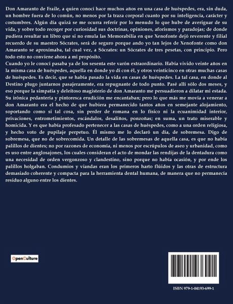 Don Amaranto de Fraile, a quien conocí hace muchos años en una casa de huéspedes, era, sin duda, un hombre fuera de lo común, no menos por la traza corporal cuanto por su inteligencia, carácter y costumbres. Algún día quizá se me ocurra referir por lo menudo lo que hube de averiguar de su vida, y sobre todo recoger por curiosidad sus doctrinas, opiniones, aforismos y paradojas; de donde pudiera resultar un libro que si no emula las Memorabilia en que Xenofonte dejó reverente y filial recuerdo de su maestro Sócrates, será de seguro porque ando yo tan lejos de Xenofonte como don Amaranto se aproximaba, tal cual vez, a Sócrates: un Sócrates de tres pesetas, con principio. Pero todo esto no conviene ahora a mi propósito. Cuando yo le conocí pasaba ya de los sesenta este varón extraordinario. Había vivido veinte años en la misma casa de huéspedes, aquella en donde yo di con él, y otros veinticinco en otras muchas casas de huéspedes. Es decir, que se había pasado la vida en casas de huéspedes. La tal casa, en donde al Destino plugo juntarnos pasajeramente, era repugnante de todo punto. Pasé allí sólo dos meses, y eso porque la simpatía y deleitoso magisterio de don Amaranto me persuadieron a dilatar mi estada. Su irónica pedantería y pintoresca erudición me encantaban; pero lo que más me movía a venerar a don Amaranto era el hecho de que hubiera permanecido tantos años en semejante alojamiento, soportando como si tal cosa, sin perder de romana en lo físico ni la ecuanimidad interior, privaciones, entrometimientos, escándalos, desaliños, ponzoñas; en suma, un trato miserable y homicida. Y es que había profesado pertenecer a las casas de huéspedes, como a una orden religiosa, y hecho voto de pupilaje perpetuo. Él mismo me lo declaró un día, de sobremesa. Digo de sobremesa, que no de sobrecomida. Un detalle de las sobremesas de aquella casa, es que no había palillos de dientes; no por razones de economía, ni menos por escrúpulos de aseo y urbanidad, como es uso entre anglosajones, los cuales consideran el acto de mondar las rendijas de la dentadura como una necesidad de orden vergonzoso y clandestino, sino porque no había ocasión, y por ende los palillos holgaban. Condumios y viandas eran los primeros harto flúidos y las otras de estructura demasiado coherente y compacta para la herramienta dental humana, de manera que no permanecía residuo alguno entre los dientes.