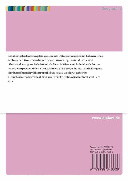 Die vorliegende Untersuchung fand im Rahmen eines technischen Großversuchs zur Geruchssanierung zweier durch einen Abwasserkanal geruchsbelasteter Gebiete in Wien statt. In beiden Gebieten wurde entsprechend den VDI-Richtlinien (VDI 3883) die Geruchsbelästigung der betroffenen Bevölkerung erhoben, sowie die durchgeführten Geruchssanierungsmaßnahmen aus umweltpsychologischer Sicht evaluiert.