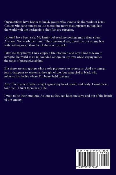 Organizations have begun to build, groups who want to rid the world of betas. Groups who take omegas to use as nothing more than capsules to populate the world with the designations they feel are superior. I should have been safe. My family believed me nothing more than a beta. Average. Not worth their time. They disowned me, threw me out on my butt with nothing more than the clothes on my back. Little did they know, I was simply a late bloomer, and now I had to learn to navigate the world as an unbounded omega on my own while staying under the radar of possessive alphas. But there are also groups whose sole purpose is to protect us. And my omega just so happens to awaken at the sight of the four men clad in black who infiltrate the facility where I'm being held prisoner. Now I'm in a new battle - a fight against my heart, mind, and body. I want these four men. I want them in my life. I want to be their omega. As long as they can keep me alive and out of the hands of the enemy. Belated Omega is a why choose, poly am romance that includes MM and MMFMM. Meaning not only does Violet have a pack of beautiful alphas, but two of her alphas are romantically involved with each other.
