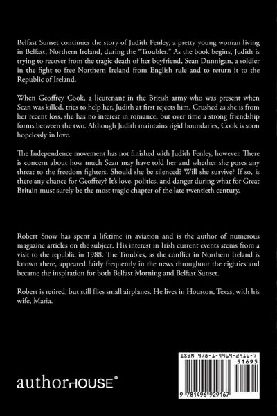 Belfast Sunset continues the story of Judith Fenley, a pretty young woman living in Belfast, Northern Ireland, during the "Troubles." As the book begins, Judith is trying to recover from the tragic death of her boyfriend, Sean Dunnigan, a soldier in the fight to free Northern Ireland from English rule and to return it to the Republic of Ireland. When Geoffrey Cook, a lieutenant in the British army who was present when Sean was killed, tries to help her, Judith at first rejects him. Crushed as she is from her recent loss, she has no interest in romance, but over time a strong friendship forms between the two. Although Judith maintains rigid boundaries, Cook is soon hopelessly in love. The Independence movement has not finished with Judith Fenley, however. There is concern about how much Sean may have told her and whether she poses any threat to the freedom fighters. Should she be silenced? Will she survive? If so, is there any chance for Geoffrey? It's love, politics, and danger during what for Great Britain must surely be the most tragic chapter of the late twentieth century.