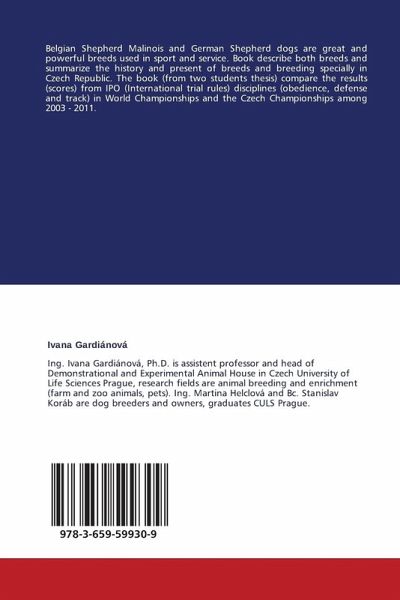 Belgian Shepherd Malinois and German Shepherd dogs are great and powerful breeds used in sport and service. Book describe both breeds and summarize the history and present of breeds and breeding specially in Czech Republic. The book (from two students thesis) compare the results (scores) from IPO (International trial rules) disciplines (obedience, defense and track) in World Championships and the Czech Championships among 2003 - 2011.