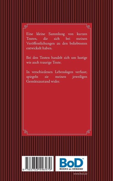 Eine kleine Sammlung von kurzen Texten, die sich bei meinen Veröffentlichungen zu den beliebtesten entwickelt haben. Bei den Texten handelt sich um lustige wie auch traurige Texte.In verschiedenen Lebenslagen verfasst, spiegeln sie meinen jeweiligen Gemütszustand wider.