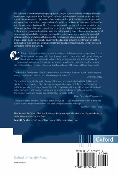 This concise overview volume pulls together the empirical findings of the Beliefs in Government series and sets them in the broad context of mass politics in modern Europe. Its conclusions about political participation, mass political opinion, postmaterialism and postmodernism, and democratic change and stability break new ground in political science.