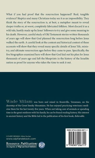 What if you had proof that the resurrection happened? Real, tangible evidence? Skeptics and many Christians today see it as an impossibility. They think the story of the resurrection is, at best, a metaphor meant to reveal deeper truths or, at worst, completely fabricated folklore. Most discard it as a wild tale, hastily made up by Jesus' followers to try and give some meaning to his death. However, careful study of Old Testament stories written thousands of years ago will show that God planned the resurrection long before Jesus walked the earth. A careful look at the content and historical context of these accounts will show that they reveal many specific details of Jesus' life, ministry, and ultimate resurrection ages before they came to pass. Specifically, the five biographies examined here will show that God laid out his plan for Jesus thousands of years ago and left the blueprints in the history of the Israelite nation as proof for anyone who takes the time to seek it out.