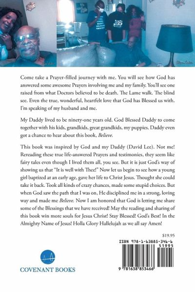 Come take a Prayer-filled journey with me. You will see how God has answered some awesome Prayers involving me and my family. You'll see one raised from what Doctors believed to be death. The Lame walk. The blind see. Even the true, wonderful, heartfelt love that God has Blessed us with. I'm speaking of my husband and me.My Daddy lived to be ninety-one years old. God Blessed Daddy to come together with his kids, grandkids, great grandkids, my puppies. Daddy even got a chance to hear about this book, Believe.This book was inspired by God and my Daddy (David Lee). Not me! Rereading these true life-answered Prayers and testimonies, they seem like fairy tales even though I lived them all, you see. But it is just God's way of showing us that "It is well with Thee!" Now let us begin to see how a young girl baptized at an early age, gave her life to Christ Jesus. Thought she could take it back. Took all kinds of crazy chances, made some stupid choices. But when God saw the path that I was on, He disciplined me in a strong, loving way and made me Believe. Now I am honored that God is letting me share some of the Blessings that we have received! May the reading and sharing of this book win more souls for Jesus Christ! Stay Blessed! God's Best! In the Almighty Name of Jesus! Holla Glory Hallelujah as we all say Amen!