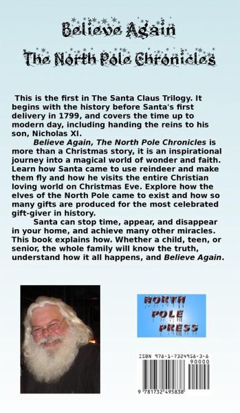 Believe Again, The North Pole Chronicles by Joe Moore is more than a Christmas tale-it's a sweeping, imaginative journey through the hidden history and magical mechanics of Santa Claus and the North Pole. Overview This is the first book in The Santa Claus Trilogy, beginning in 1799 before Santa's first delivery and continuing through to the present day. It reveals how Santa came to use flying reindeer, how he manages to visit the entire Christian-loving world in one night, and how the elves came to be. From time-stopping miracles to gift-making marvels, the story blends fantasy with faith and historical events. For All Ages Whether you're a curious child, a nostalgic grandparent, or a homeschooling parent, this book offers a heartwarming and logical explanation of Santa's mysteries. It's designed to rekindle belief and wonder in readers of every generation. Series Context This volume sets the stage for the trilogy, followed by Faith, Hope & Reindeer and Glaciers Melt and Mountains Smoke. It's also a delightful resource for educators looking to teach history through storytelling.