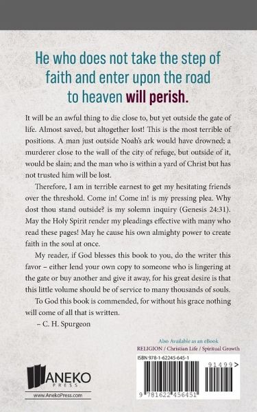He who does not take the step of faith and enter upon the road to heaven will perish. It will be an awful thing to die close to, but yet outside the gate of life. Almost saved, but altogether lost! This is the most terrible of positions. A man just outside Noah’s ark would have drowned; a murderer close to the wall of the city of refuge, but outside of it, would be slain; and the man who is within a yard of Christ but has not trusted him will be lost. Therefore, I am in terrible earnest to get my hesitating friends over the threshold. Come in! Come in! is my pressing plea. Why dost thou stand outside? is my solemn inquiry (Genesis 24:31). May the Holy Spirit render my pleadings effective with many who read these pages! May he cause his own almighty power to create faith in the soul at once. My reader, if God blesses this book to you, do the writer this favor – either lend your own copy to someone who is lingering at the gate or buy another and give it away, for his great desire is that this little volume should be of service to many thousands of souls. To God this book is commended, for without his grace nothing will come of all that is written. – C. H. Spurgeon