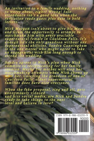 An invitation to a family wedding, nothing to worry about, right? Wrong! Solo attendance isn't a good idea when the invitation reads guest plus date in bold letters. Nick Morgan isn't about to give his Mom and Gram the opportunity to attempt to matchmake him with every available supernatural female in Cauldron Falls. It's enough he's the only grandson without any supernatural abilities. Sandra Cunningham is the one mortal who might agree to fake an engagement with him long enough to attend the wedding. Sandra agrees to Nick's plan when Nick commits to reciprocating for her family reunion. Maybe her mother will stop her matchmaking attempts when Nick shows up with her. Catching the grandson of one of Cauldron Falls' oldest supernatural families does have nice overtones. When the fake proposal, ring and all, gets anonymously videoed and hits social media, are Nick and Sandra ready to take things to the next level and believe in love?