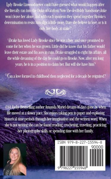 Lady Brooke Linwood never imagined that a single, literal collision with the Duke of Grafton would turn her world upside down. The devilishly handsome duke, with his persistent charm and intense gaze, seems determined to stay in her life. With each encounter, Brooke's resolve to resist him weakens, leaving her torn between her head and her heart. Is it love she feels, or merely desire? Drake, Duke of Grafton, has harbored a deep love for Lady Brooke since they were children. A decade ago, he vowed to return for her, unaware that his father's mismanagement would leave him with a crumbling estate and financial ruin. For ten years, Drake has fought to restore his family's legacy, all the while dreaming of Brooke. Now, he finally has the means to claim her, but doubts linger. Will she accept him after all this time? Can a love forged in the innocence of youth survive a decade of neglect and hardship? Drake and Brooke must confront their pasts and the burning question: can their rekindled passion withstand the trials of the present?