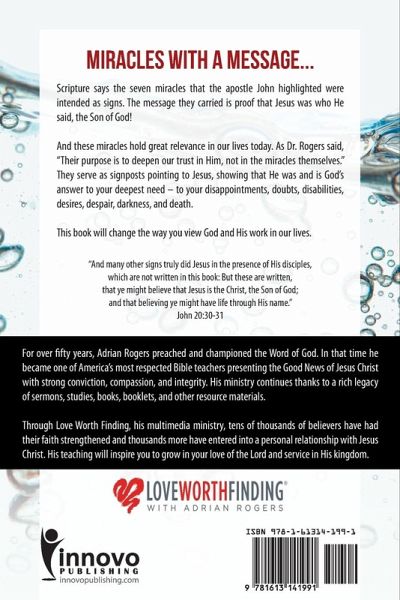 - Miracles with a Message . . . Seven Miracles Jesus Did for You - Scripture says the seven miracles that the apostle John highlighted were intended as signs. The message they carried is proof that Jesus was who He said, the Son of God! And these miracles hold great relevance in our lives today. As Dr. Rogers said, "Their purpose is to deepen our trust in Him, not in the miracles themselves." They serve as signposts pointing to Jesus, showing that He was and is God's answer to your deepest need - to your disappointments, doubts, disabilities, desires, despair, darkness and death. - This book will change the way you view God and His work in our lives. - "And many other signs truly did Jesus in the presence of His disciples, which are not written in this book: But these are written, that ye might believe that Jesus is the Christ, the Son of God; and that believing ye might have life through His name." - John 20:30-31 -ABOUT ADRIAN ROGERS & LOVE WORTH FINDING: For over fifty years, Adrian Rogers preached and championed the Word of God. In that time he became one of America's most respected Bible teachers presenting the Good News of Jesus Christ with strong conviction, compassion, and integrity. His ministry continues thanks to a rich legacy of sermons, studies, books, booklets, and other resource materials. Through Love Worth Finding, his multimedia ministry, tens of thousands of believers have had their faith strengthened and thousands more have entered into a personal relationship with Jesus Christ. His teaching will inspire you to grow in your love of the Lord and service in His kingdom. "And many other signs truly did Jesus in the presence of His disciples, which are not written in this book: But these are written, that ye might believe that Jesus is the Christ, the Son of God; and that believing ye might have life through His name." John 20:30-31 -ABOUT THE PUBLISHER: Innovo Publishing LLC is an independent publisher of Christian and wholesome titles, and is located near Memphis, TN. Since 2008, Innovo has published quality books, eBooks, audiobooks, music, screenplays, film, and online and physical curricula that support the Great Commission, equip believers, and help create a positive Christian worldview. Innovo's capabilities and global reach provide Christian authors, artists, and ministries access to the world for Christ. To learn more about Innovo Publishing, visit our website at innovopublishing.com. To connect with other Christian Creatives and to learn best practices for creating, publishing, marketing, and selling Christian titles, visit the Christian Publishing Portal at cpportal.com.