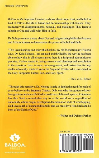 Believe in the Supreme Creator is a book about hope, trust, and belief in God. It follows the life of Dinah and her relationship with Kalson. They are faced with disappointments, betrayal, and challenges. They learn to submit to God and walk with Him in faith. Dr. Nchege weaves a story about God and religion using biblical references and African idioms to demonstrate the power of belief and faith. "This is an inspiring and enjoyable book by my old friend from my Nigeria days, Dr. Kalu Nchege. I am amazed and thrilled by the way he has been able to show that in all circumstances there is a Scriptural admonition or promise, if when trusted in, brings answers and blessings and a resolution to the situation. Here is hope, encouragement, and instruction for any reader who really wants to know the Supreme Creator who is revealed in the Holy Scriptures Father, Son, and Holy Spirit." -- Rev. Z. D. Reece "Through this narrative, Dr. Nchege is able to depict the need for each of us to believe in the Supreme Creator. Only one who has gotten to know how gracious and merciful God is could have delivered a piece of literature like this. Such a remarkable way to let the world know regardless of nationality, ethnic origin, or religious denomination style of worshipping, God loves each of us unconditionally and we must love Him back and be born of the Spirit of God." -- Wilber and Delores Parker