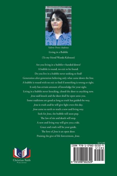 Living in a Bubble (To my friend Wanda Kabutan) Are you living in a bubble-handed down? A bubble is round, no exit to be found. Do you live in a bubble never seeking to find? Generation after generation believing only what came down the line. A bubble is round with no exit to find if something is wrong or right. It only has certain amount of knowledge for your sight. Living in a bubble never knocking, closed the door to anything new. Jesus said knock and the door shall be open unto you. Some traditions are good as long as truth has guided the way, Jesus is truth and he will give light even this day. Jesus came to earth to teach a new and living way. Seek for Jesus, the bubble will soon pop. The law of sin and death will stop. A new and living way will give you a ride. Grace and truth will be your guide. The love of Jesus is an open door. Praising the give of life forevermore, Jesus.
