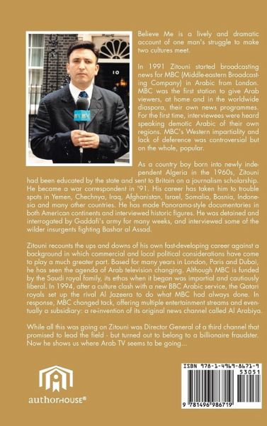 Believe Me is a lively and dramatic account of one man's struggle to make two cultures meet. In 1990 Zitouni started broadcasting news for MBC (Middle-eastern Broadcasting Company) in Arabic from London. MBC was the first station to give Arab viewers, at home and in the worldwide diaspora, their own news programmes. For the first time, interviewees were heard speaking demotic Arabic of their own regions. MBC's Western impartiality and lack of deference was controversial but on the whole, popular. As a country boy born into newly independent Algeria in the 1960s, Zitouni had been educated by the state and sent to Britain on a journalism scholarship. He became a war correspondent in '91. His career has taken him to trouble spots in Yemen, Chechnya, Iraq, Afghanistan, Israel, Somalia, Bosnia, Indonesia and many other countries. He has made Panorama-style documentaries in both American continents and interviewed historic figures. He was detained and interrogated by Gaddafi's army for many weeks, and interviewed some of the wilder insurgents fighting Bashar al Assad. Zitouni recounts the ups and downs of his own fast-developing career against a background in which commercial and local political considerations have come to play a much greater part. Based for many years in London, Paris and Dubai, he has seen the agenda of Arab television changing. Although MBC is funded by the Saudi royal family, its ethos when it began was impartial and cautiously liberal. In 1994, after a culture clash with a new BBC Arabic service, the Qatari royals set up the rival Al Jazeera to do what MBC had always done. In response, MBC changed tack, offering multiple entertainment streams and eventually a subsidiary: a re-invention of its original news channel called Al Arabiya. While all this was going on Zitouni was Director General of a third channel that promised to lead the field - but turned out to belong to a billionaire fraudster. Now he shows us where Arab TV seems to be going...