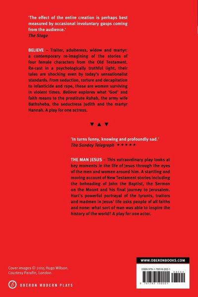 'The effect of the entire creation is perhaps best measured by occasional involuntary gasps coming from the audience.' The Stage BELIEVE - Traitor, adulteress, widow and martyr: a contemporary re-imagining of the stories of four female characters from the Old Testament. Re-cast in a psychologically truthful light, their tales are shocking even by today's sensationalist standards. From seduction, torture and decapitation to infanticide and rape, these are women surviving in violent times. Believe explores what 'God' and faith means to the prostitute Rahab, the army wife Bathsheba, the seductress Judith and the martyr Hannah. A play for one actress. '.in turns funny, knowing and profoundly sad.' The Sunday Telegraph (Five Stars) THE MAN JESUS - This extraordinary play looks at key moments in the life of Jesus through the eyes of the men and women around him. A startling and moving account of New Testament stories including the beheading of John the Baptist, the Sermon on the Mount and his final journey to Jerusalem. Hurt's powerful portrayal of the tyrants, traitors and madmen in Jesus' life asks people of all faiths and none: what sort of man was able to inspire the history of the world? A play for one actor.