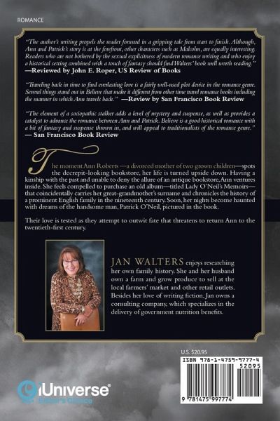 "The author's writing propels the reader forward in a gripping tale from start to finish. Although, Ann and Patrick's story is at the forefront, other characters such as Malcolm, are equally interesting. Readers who are not bothered by the sexual explicitness of modern romance writing and who enjoy a historical setting combined with a touch of fantasy should find Walters' book well worth reading." -Reviewed by John E. Roper, US Review of Books "Traveling back in time to find everlasting love is a fairly well-used plot device in the romance genre. Several things stand out in Believe that make it different from other time travel romance books including the manner in which Ann travels back." -Review by San Francisco Book Review "The element of a sociopathic stalker adds a level of mystery and suspense, as well as provides a catalyst to advance the romance between Ann and Patrick. Believe is a good historical romance with a bit of fantasy and suspense thrown in, and will appeal to traditionalists of the romance genre." - San Francisco Book Review The moment Ann Roberts -a divorced mother of two grown children-spots the decrepit-looking bookstore, her life is turned upside down. Having a kinship with the past and unable to deny the allure of an antique bookstore, Ann ventures inside. She feels compelled to purchase an old album-titled Lady O'Neil's Memoirs-that coincidentally carries her great-grandmother's surname and chronicles the history of a prominent English family in the nineteenth century. Soon, her nights become haunted with dreams of the handsome man, Patrick O'Neil, pictured in the book. Their love is tested as they attempt to outwit fate that threatens to return Ann to the twentieth-first century.