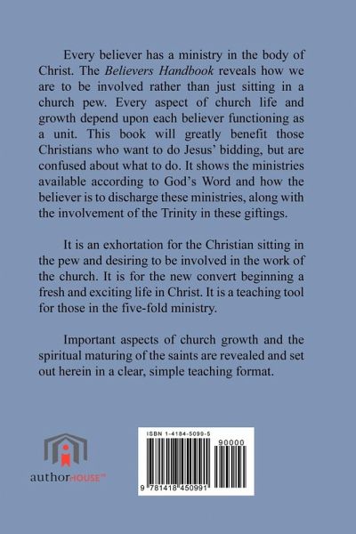 The Believer's Handbook shows that every Believer has a ministry in the Body of Christ. We are to be involved, not just sitting in the pew. All aspects of church life and growth depend upon our functioning as a unit. Some of the most miserable people are Christians wanting to do Jesus' bidding, but not knowing what to do. The Believer's Handbook is the answer to their dilemma. It shows what ministries are available, how to discharge these ministries, and the Trinity's involvement in these ministries. It is written for the Christian sitting in the pew and wanting to be involved in church work, for the new convert beginning an exciting life in Christ, and for the Five Fold Ministry as a teaching tool in their ministry. The Believer's Handbook reveals important aspects of church growth and the spiritual maturing of the Saints in a clear, simple teaching format.