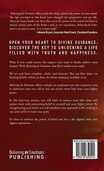 Open your heart to divine guidance. Discover the key to unlocking a life filled with truth and happiness. What if you could receive the support you need to finally achieve your dreams? With Believing by Emotions, that life is within your reach. We are each born complete, whole, and innocent. But our false ideas-or limiting beliefs-block us from the divine assistance available to us. Believing by Emotions offers a simple yet profound tool that empowers you to rediscover your true self so you can receive more help from your higher power. In this four-step process, you will learn to remove your false ideas and replace them with unwavering belief in yourself and your higher power. By strengthening your belief, you will transform your approach to life, making it easy and joyful to reach your goals. It's time to embrace the power of belief and live a life aligned with your highest aspirations. "Believing by Emotions offers tools that help unlock the power of your mind. The tips provided in this book have changed my perspective and my life. There are many books out there that cover the power of the mind and how to unlock certain parts of the brain, and in my experience, Believing by Emotions is second to none. It is a must-read!" -Johnnie Bryant, Associate Head Coach, Cleveland Cavaliers.