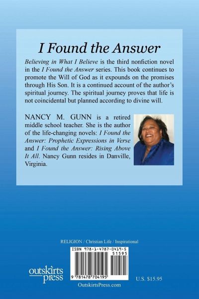 Believing in What I Believe is the third nonfiction novel in the I Found the Answer series. When trials come to test all that you know, what will you do? This novel is the author's account of an extended journey of withstanding that which appeared to be the insurmountable. Inspired poetry and prose form a relationship to evoke a response to the question: Do I believe in what I believe. The answer is bouncing off every page!