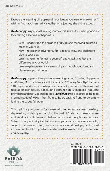 Explore the meaning of happiness in our lives as you learn of one woman's wish to find happiness, which led her on a journey she didn't expect. Belifehappy is a personal healing journey that shares four main principles for creating a lifetime of happiness: Give-understand the balance of giving and receiving across all areas of your life. Play- rediscover adventure, fun, and creativity, and add more play to your day. Love-take time for loving yourself, and watch and feel the difference in your world. Learn-gain greater awareness of your thoughts, actions, and ultimately, your choices. Belifehappy begins with a spiritual awakening during "Finding Happiness and Steak, Mash Potatoes, and Onion Gravy." "Sunny-Side Up" features 110 inspiring stories including poetry, short guided meditations and relaxation techniques, concluding with 365 daily inspiring, thought provoking and motivational quotes. Belifehappy is designed to be read in a multitude of ways-from front to back, back to front, or by simply letting the pages fall open. This uplifting volume is for those who experience stress, anxiety, depression, or simply a changing life path. It's also for those who are curious about optimism and challenging current thoughts and actions. Seize this opportunity to discover new perspectives across everyday subjects-communication, careers, interests, relationships, health, and achievements. Take a positive step forward to love life today, tomorrow, and every day.