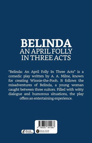 "Belinda: An April Folly In Three Acts" is a comedic play written by A. A. Milne, known for creating Winnie-the-Pooh. It follows the misadventures of Belinda, a young woman caught between three suitors. Filled with witty dialogue and humorous situations, the play offers an entertaining experience.