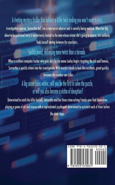 He's watching you. Through your computer and on your phone. You can run, but you can't hide. A riveting mystery thriller that delivers a killer twist ending you won't want to miss. Investigative reporter, Samantha Bell, has a new secret admirer and is secretly being watched. When her big about-to-be-published story is mysteriously leaked to the man whose crimes she's going to expose, she suddenly finds herself staring between the crosshairs. Swiftly paced, delivering more twists than a tornado. When a ruthless computer hacker who goes only by the name Loxley begins targeting the rich and famous, Samantha is quickly drawn into the investigation. With murders made to look like accidents, greed quickly becomes the number one killer. A big secret hides within...will you be the first to solve the puzzle, or will you also become a victim of deception? Determined to catch the killer herself, Samantha and her three crime-solving friends soon find themselves playing a game of cat and mouse with a sophisticated psychopath determined to outsmart each of them before the clock stops.