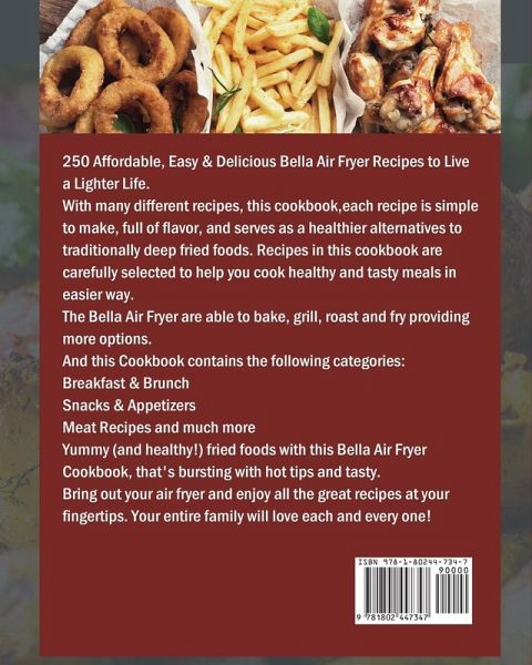 250 Affordable, Easy & Delicious Bella Air Fryer Recipes to Live a Lighter Life. With many different recipes, this cookbook,each recipe is simple to make, full of flavor, and serves as ¿ healthier alternatives to traditionally deep fried foods. Recipes in this cookbook are carefully selected to help you cook healthy and tasty meals in easier way. The Bella Air Fryer are able to bake, grill, roast and fry providing more options. And this Cookbook contains the following categories: Breakfast & Brunch Snacks & Appetizers Meat Recipes and much more Yummy (and healthy!) fried foods with this Bella Air Fryer Cookbook, that's bursting with hot tips and tasty. Bring out your air fryer and enjoy all the great recipes at your fingertips. Your entire family will love each and every one!