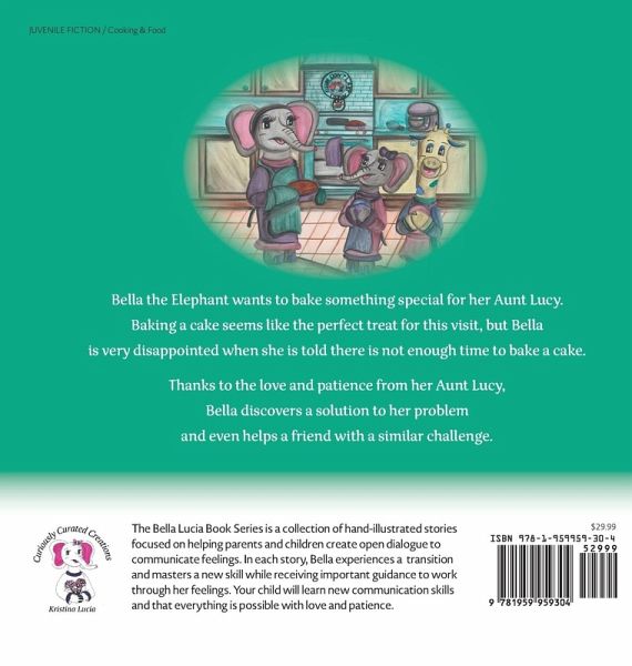 Bella the Elephant wants to bake something special for her Aunt Lucy. Baking a cake seems like the perfect treat for this visit, but Bella is very disappointed when she is told there is not enough time to bake a cake. Thanks the love and patience from her Aunt Lucy, Bella discovers a solution to her problem and even helps a friend with a similar challenge.