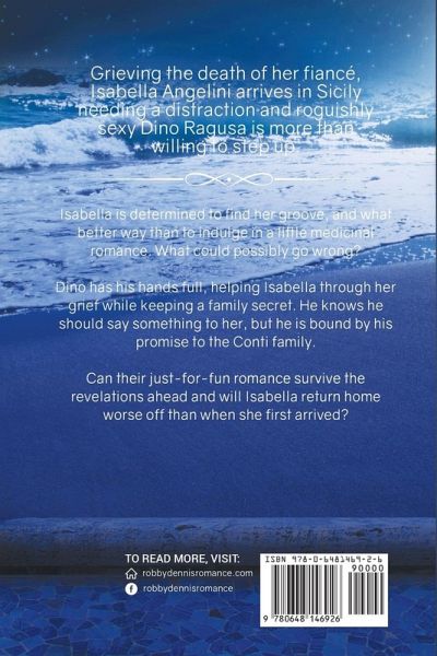 Grieving the death of her fiancé, Isabella Angelini arrives in Sicily needing a distraction and roguishly sexy Dino Ragusa is more than willing to step up. Isabella is determined to find her groove, and what better way than to indulge in a little medicinal romance. What could possibly go wrong? Dino has his hands full, helping Isabella through her grief while keeping a family secret. He knows he should say something to her, but he is bound by his promise to the Conti family. Can their just-for-fun romance survive the revelations ahead and will Isabella return home worse off than when she first arrived?