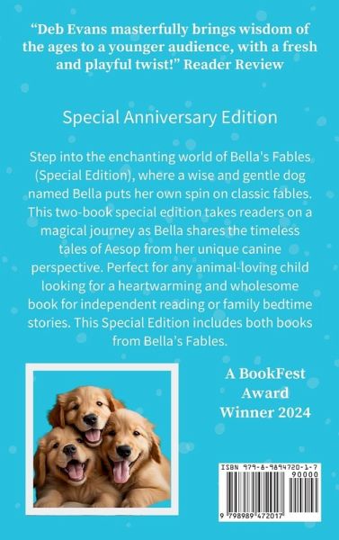 Poor Bella is one tired Momma Dog! Her active puppies play all day and all night. She needs to find a way to get them to go to sleep! Step into the enchanting world of Bella's Fables, where a wise and gentle dog named Bella puts her own spin on classic fables to lull her energetic puppies to sleep. This charming children's chapter book takes readers on a magical journey as Bella shares the timeless tales of Aesop from her unique canine perspective. As Bella's puppies listen intently, they learn valuable lessons about honesty, perseverance, and the perils of being too boastful. Bella's charming personality shines through as she engages in conversations with her pups, putting her own twist on these age-old stories. Along the way, the pups also discover the joys of snuggling up with a good story and the comfort of a loving family. Join Bella, Abby, Emma, and Freddy on their unforgettable adventure through the world of fables and uncover the timeless wisdom and wonder that lies within. Perfect for any animal-loving child seeking a heartwarming bedtime story, Bella's Fables is an absolute must-read. This Special Edition hardcover includes both Bella's Fables and Bella's Fables, Too - MORE classic stories for playful pups. A BookFest Award Winner 2024