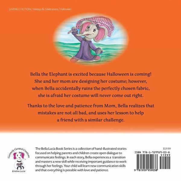 Bella the Elephant is excited because Halloween is coming! She and her mom are designing her costume; however, when Bella accidentally ruins the perfectly chosen fabric, she is afraid her costume will never come out right. Thanks to the love and patience from Mom, Bella realizes that mistakes are not all bad, and uses her lesson to help a friend with a similar challenge.